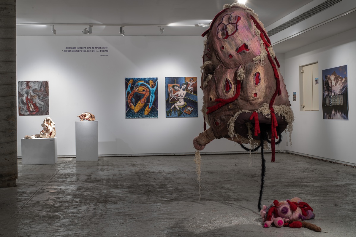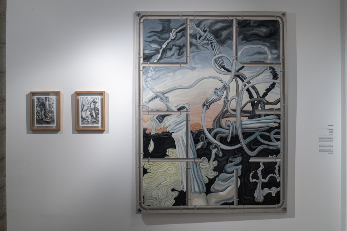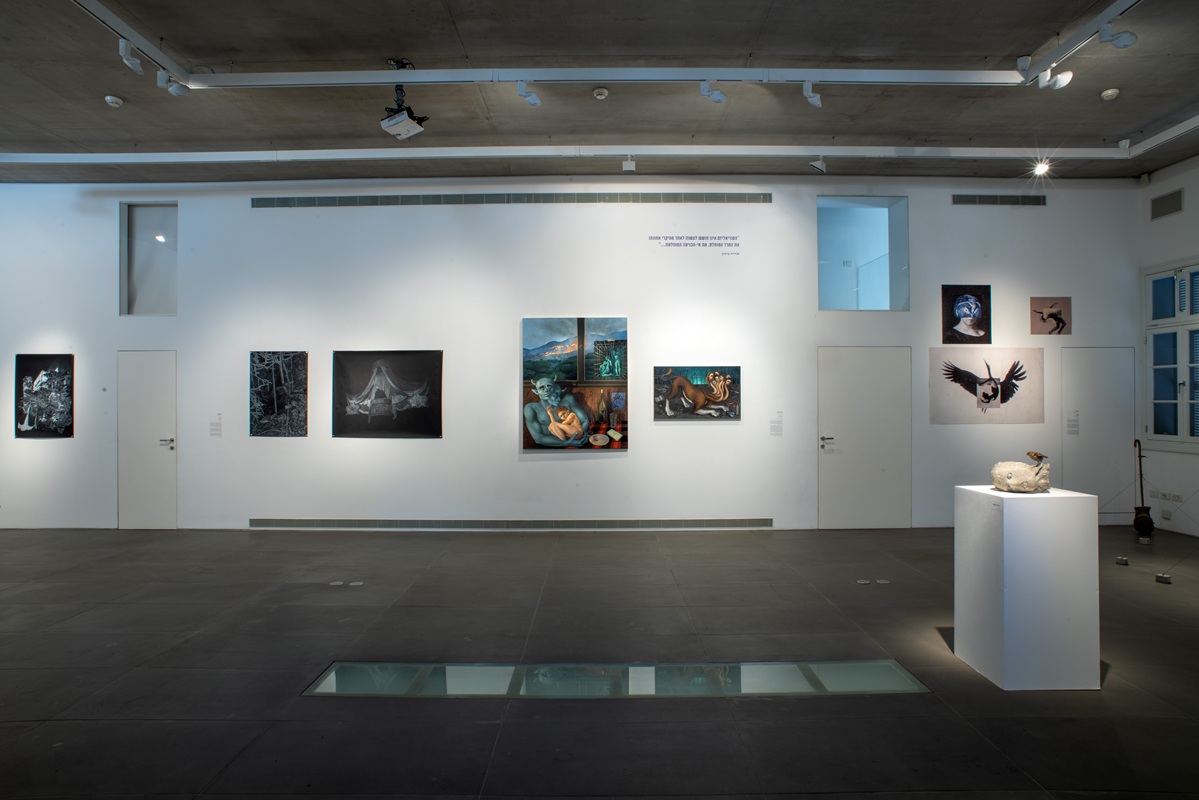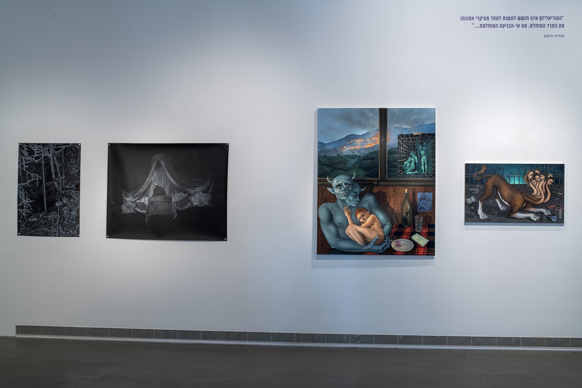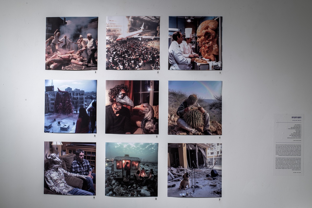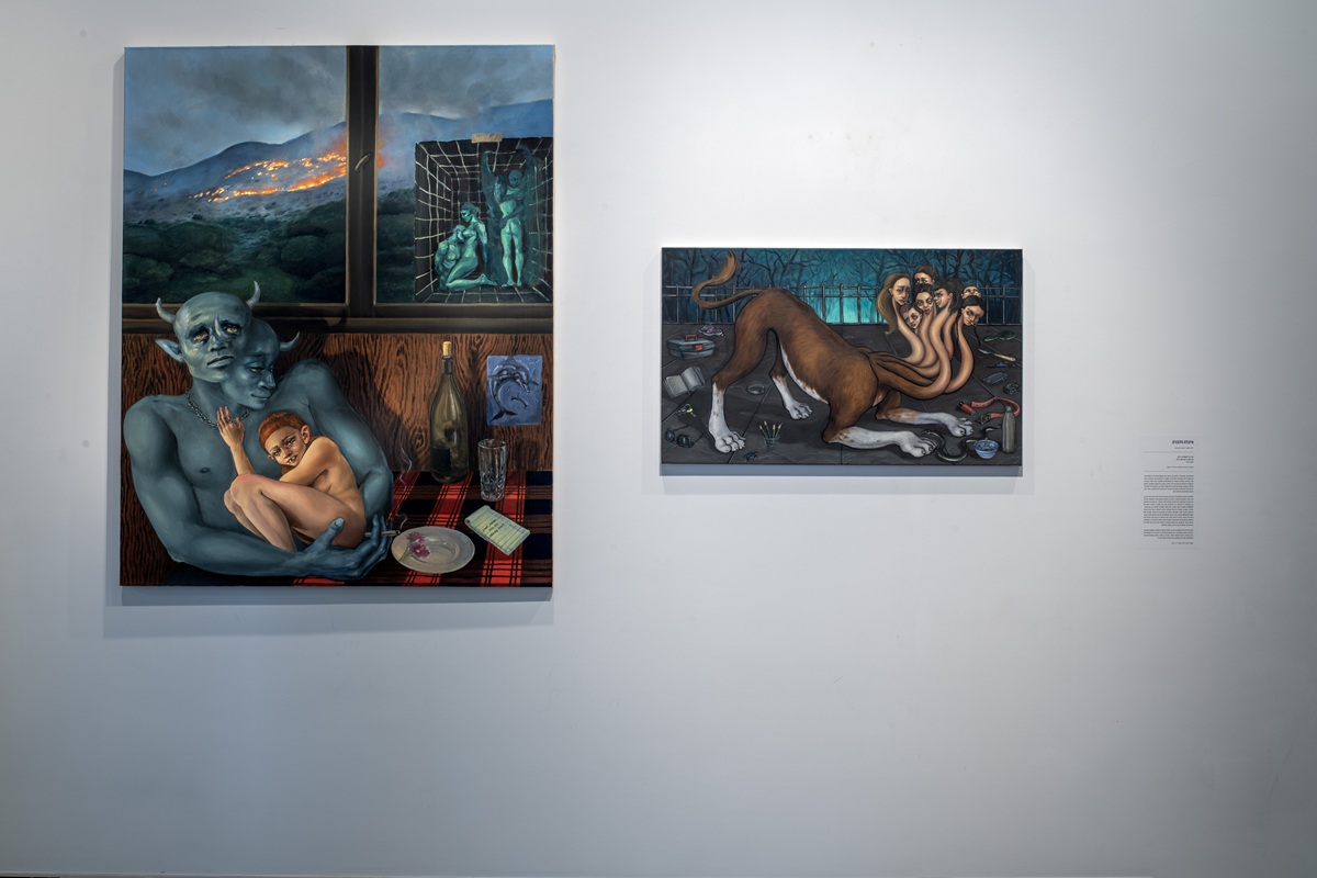 The works in the exhibition highlight several through lines: many of them show collage-like thinking both in painting and in photographic assemblage techniques. In this respect, an intriguing dialogue is created here between established artists such as Dov Or Ner, Nurit David, Drora Dominey, Meir Pichhadze, and Shosh Kormosh, and young emerging artists. Some works relate to the disrupted urban space and holy places; others refer to figures of monstrous leaders and episodes from local history. Additional works relate to hybridity, to the formal fluidity of objects and bodies, and to apocalyptic-dystopian aspects stemming from human impact on the environment. The combination of all of these raises the sense of the surreal and haunting atmosphere of our wartime reality.