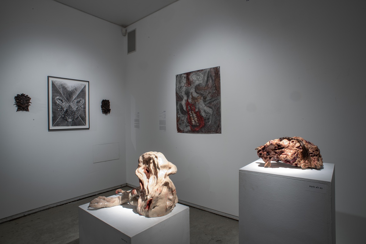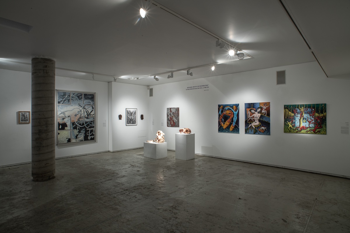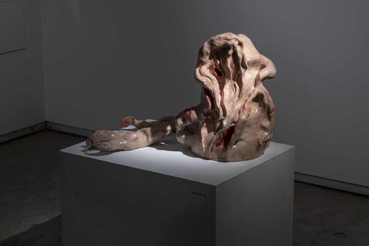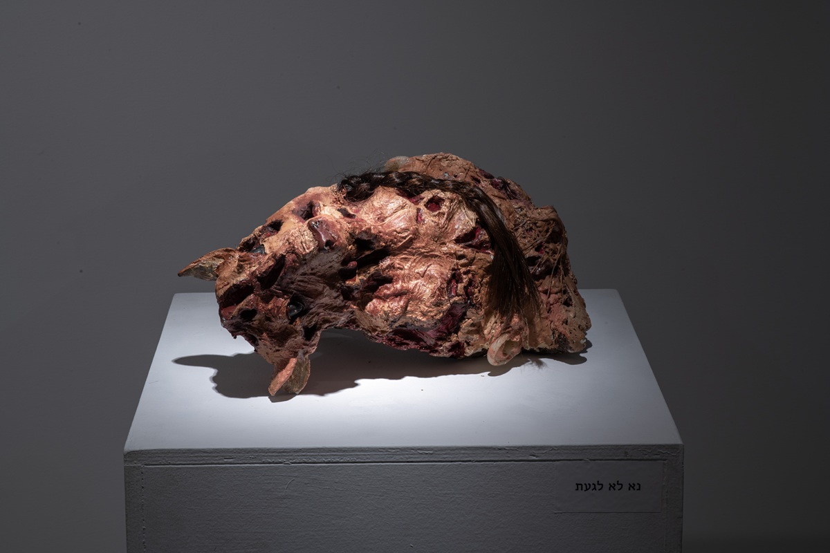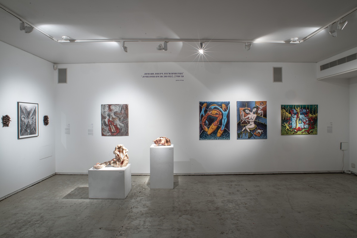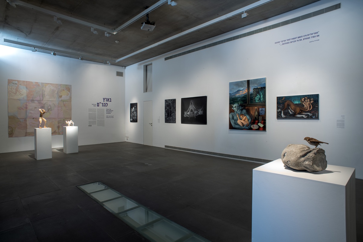The works in the exhibition highlight several through lines: many of them show collage-like thinking both in painting and in photographic assemblage techniques. In this respect, an intriguing dialogue is created here between established artists such as Dov Or Ner, Nurit David, Drora Dominey, Meir Pichhadze, and Shosh Kormosh, and young emerging artists. Some works relate to the disrupted urban space and holy places; others refer to figures of monstrous leaders and episodes from local history. Additional works relate to hybridity, to the formal fluidity of objects and bodies, and to apocalyptic-dystopian aspects stemming from human impact on the environment. The combination of all of these raises the sense of the surreal and haunting atmosphere of our wartime reality.