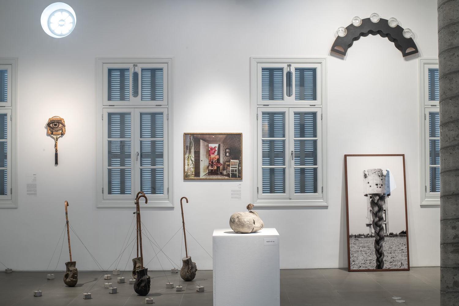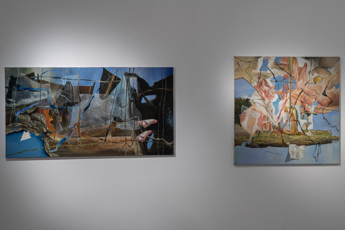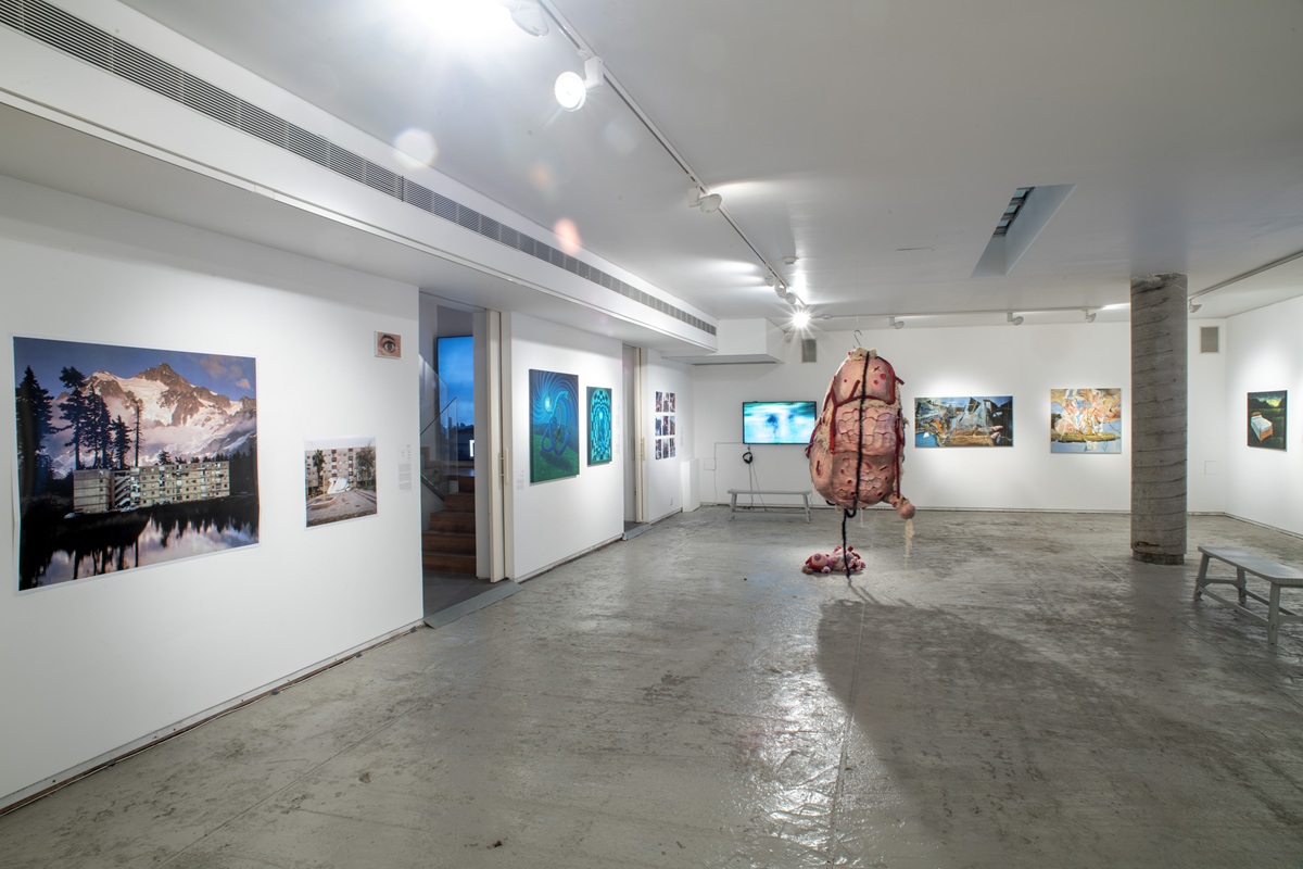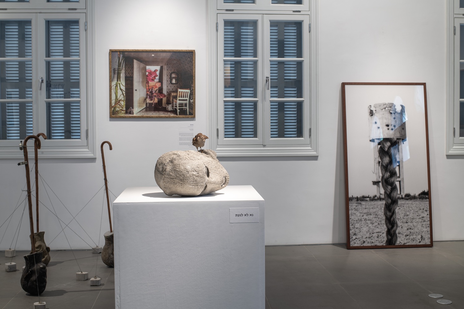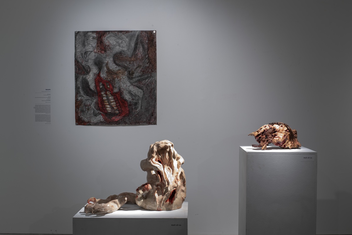 The works in the exhibition highlight several through lines: many of them show collage-like thinking both in painting and in photographic assemblage techniques. In this respect, an intriguing dialogue is created here between established artists such as Dov Or Ner, Nurit David, Drora Dominey, Meir Pichhadze, and Shosh Kormosh, and young emerging artists. Some works relate to the disrupted urban space and holy places; others refer to figures of monstrous leaders and episodes from local history. Additional works relate to hybridity, to the formal fluidity of objects and bodies, and to apocalyptic-dystopian aspects stemming from human impact on the environment. The combination of all of these raises the sense of the surreal and haunting atmosphere of our wartime reality.