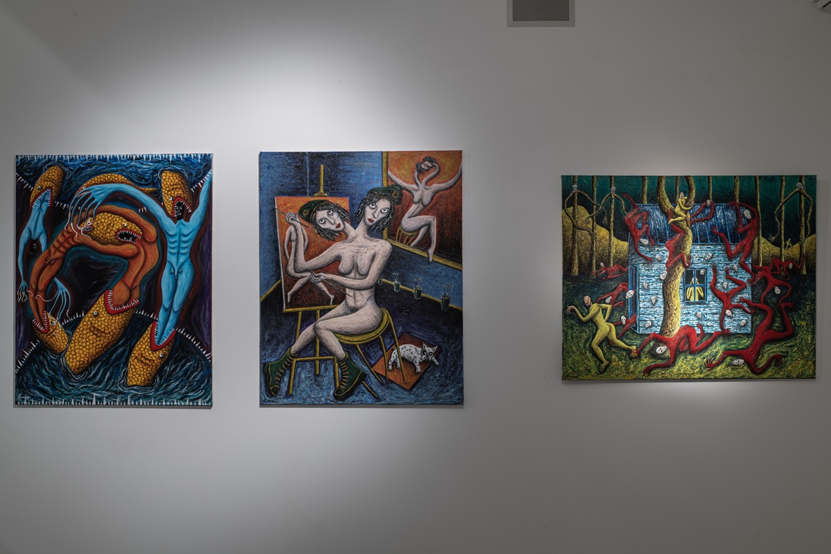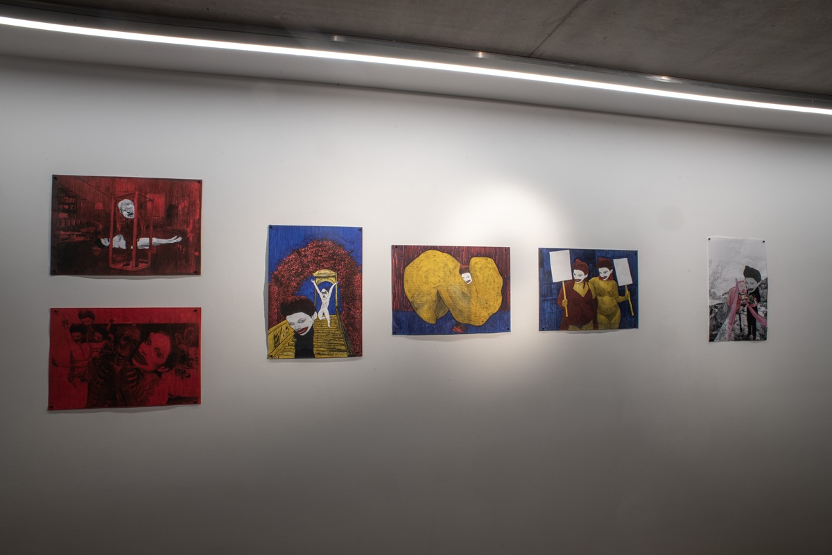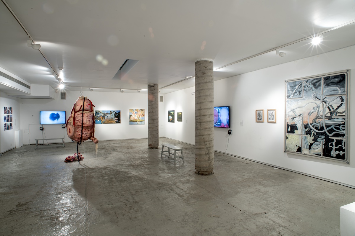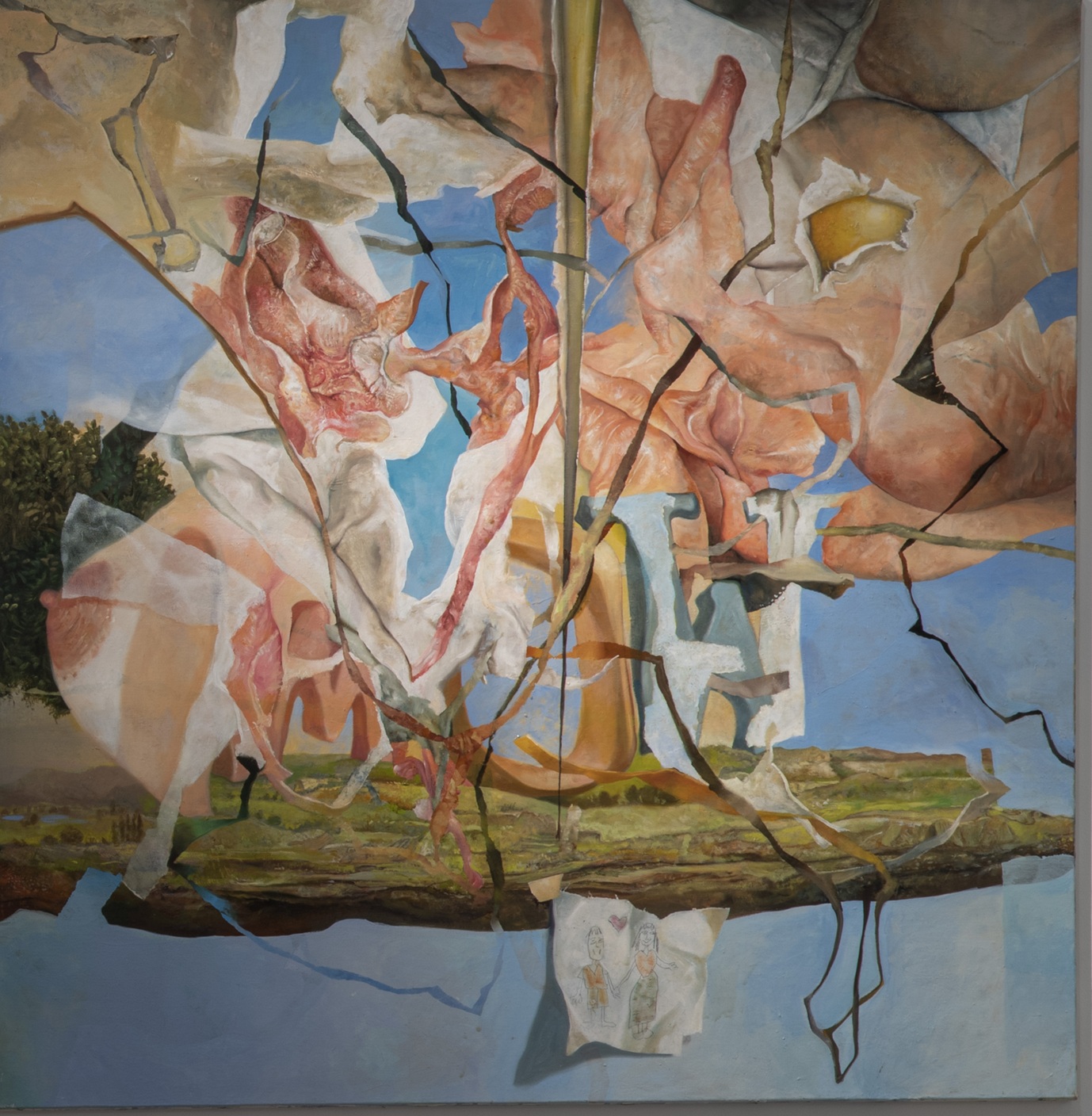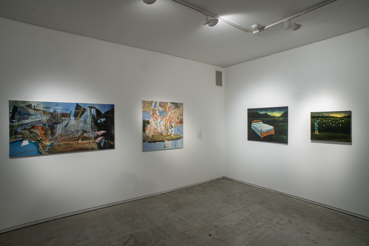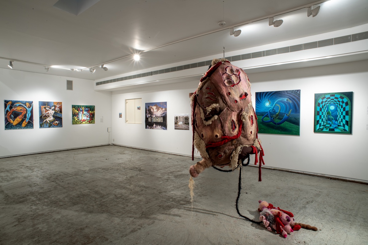 The works in the exhibition highlight several through lines: many of them show collage-like thinking both in painting and in photographic assemblage techniques. In this respect, an intriguing dialogue is created here between established artists such as Dov Or Ner, Nurit David, Drora Dominey, Meir Pichhadze, and Shosh Kormosh, and young emerging artists. Some works relate to the disrupted urban space and holy places; others refer to figures of monstrous leaders and episodes from local history. Additional works relate to hybridity, to the formal fluidity of objects and bodies, and to apocalyptic-dystopian aspects stemming from human impact on the environment. The combination of all of these raises the sense of the surreal and haunting atmosphere of our wartime reality.